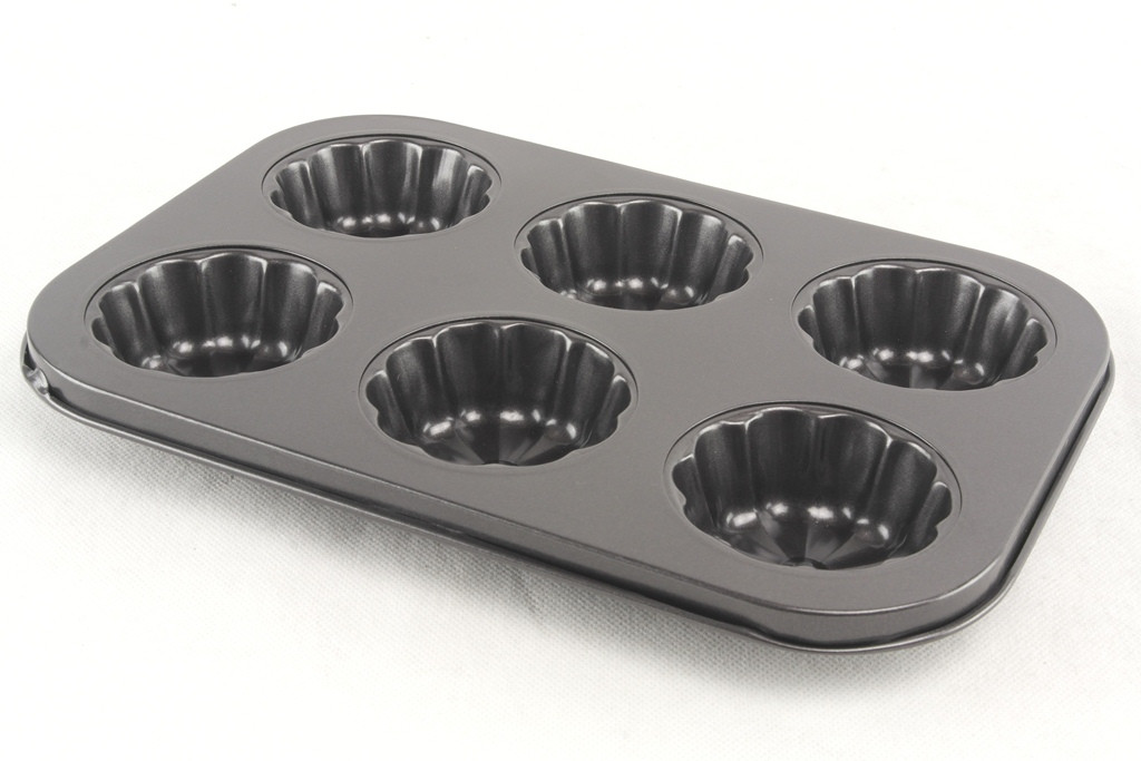 оптом форму для мафінів і кексів з антипригарним покриттям. Виготовлена з вуглецевої сталі, вирізняється високою міцністю і зносостійкістю. Внутрішнє та зовнішнє багатошарове антипригарне покриття, безпечне для здоров'я та легке в догляді, забезпечує рівномірне пропікання та легке вилучення з форми готового виробу. Форма дає змогу одночасно випікати 6 мафінів гарної форми з хвилеподібними сторонами та фігурним дном.